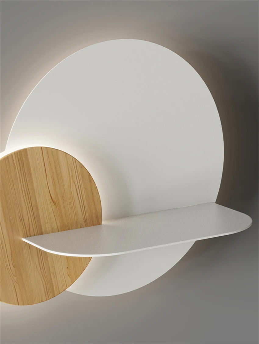 It consists of two overlapping circles: a large white circle and a smaller light wood circle. A thin white shelf crosses the two shapes.